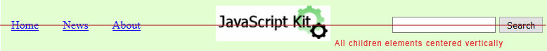 <!-- HTML: Flex container with 3 flex items --> <header class="topheader"> <nav class="left"> <a href="#">Home</a> <a href="#">News</a> <a href="#">About</a> </nav> <a href="#"><img src="jklogosmall.gif" /></a> <form> <input type="text" /> <input type="submit" value="Search" /> </form> </header>