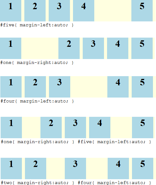 Here are some examples of adding margins to specific flex elements inside a flex container to control individual horizontal alignment: