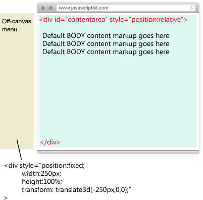 <!doctype html> <head> <meta name="viewport" content="width=device-width, initial-scale=1" /> <style type="text/css"> /* Menu styles added here */ </style> </head> <body> <input type="checkbox" id="togglebox" /> <nav id="offcanvas-menu"> Menu contents to be added </nav> <div id="contentarea"> <label for="togglebox" id="navtoggler">Menu</label> Some body content here some body content here </div> </body> </html>