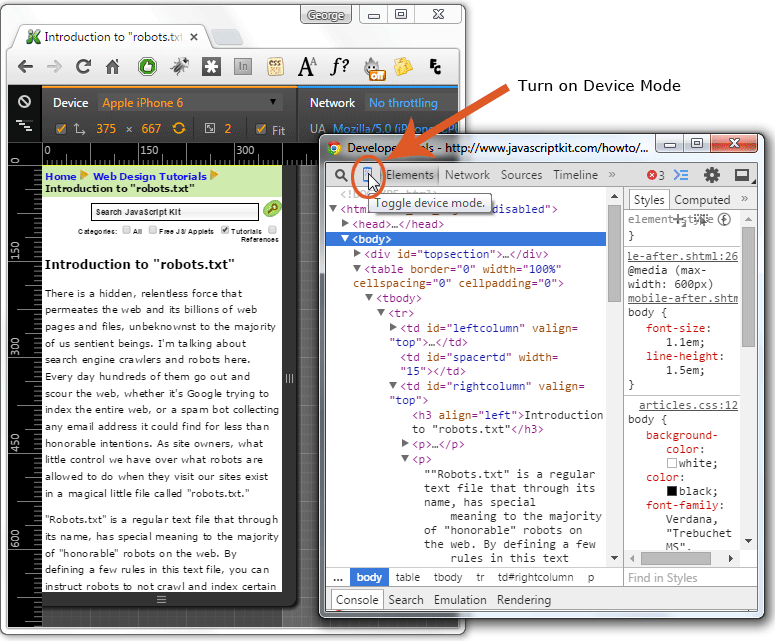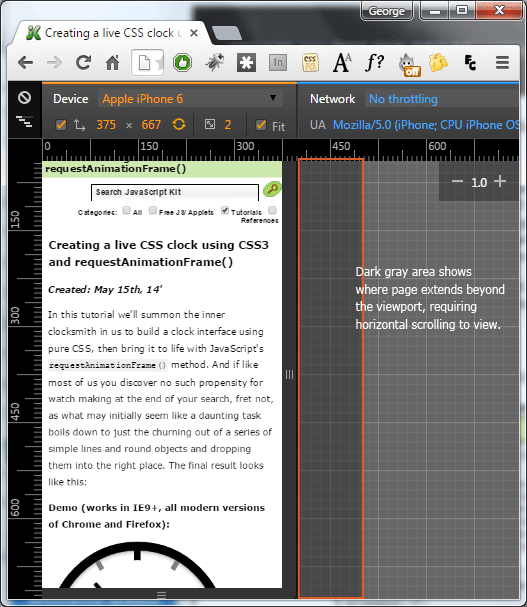 In the screenshot above I've chosen to see how the page appears in iPhone 6 via the drop down menu. You may need to refresh the page at this point to get an accurate emulation of the selected device, whether it's iPhone 6, HTC One X, or Apple iPad etc. When viewing a page in the emulation screen, a useful area to pay attention to is any dark gray areas behind the webpage: