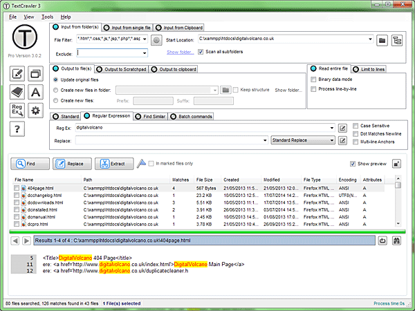 TextCrawler comes in both a freeware (non commercial use) and Pro version, with some of the notable features of the Pro being ability to output to a new file or Folder, search and replace in Clipboard, and Command Line control.