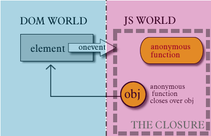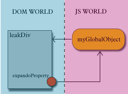 Here is a diagram describing the closure which creates a circular reference between the DOM world and the JS world.